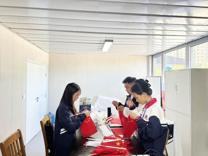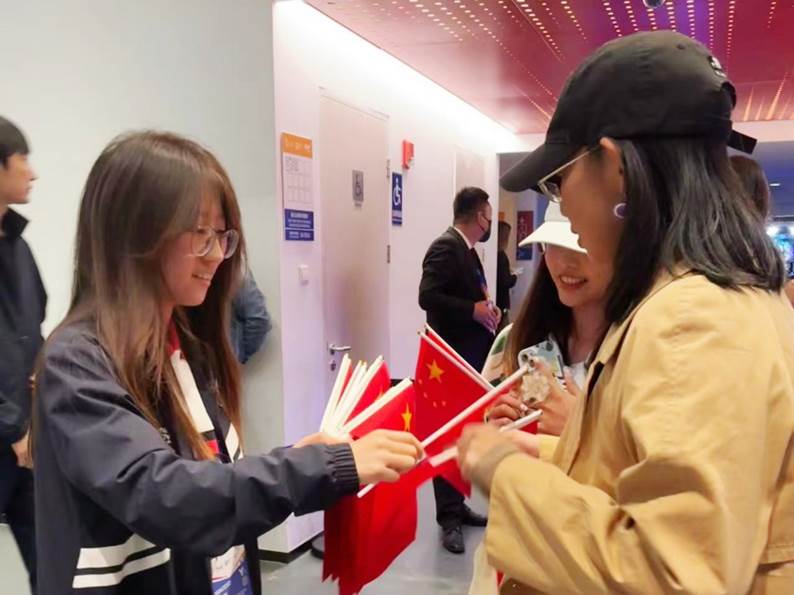 中网赛期恰逢国庆,为表达对伟大祖国的美好祝愿,营造庄严喜庆的节日氛围,EMC易倍本科生、现任公司青年志愿者协会主席的耿瑞璇带领志愿者们细心的为观众分发手持国旗,传承爱国情怀,弘扬爱国主义精神。